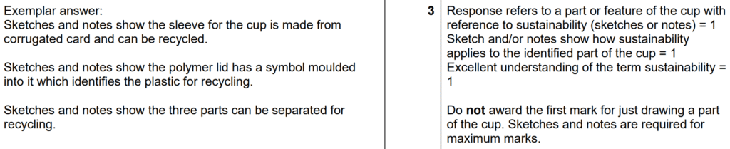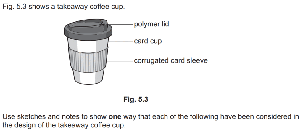 Examiner comment: Candidates were asked to use sketches and notes to show how sustainability had been considered in the design of takeaway coffee cup. Many excellent responses were seen to this question, with the quality of sketches and notes usually of a very high standard. The most common responses referred to card and corrugated card which could be recycled after use, the fact that card is biodegradable so it would not need to go into landfill or be incinerated, and that the polymer lid could easily be separated from cup and sleeve for recycling.