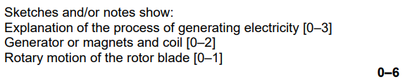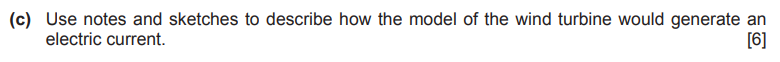 Candidates found it very challenging to explain how the model of the wind turbine would generate an electric current. Some candidates understood the use of rotary motion being utilised from the rotor blades.