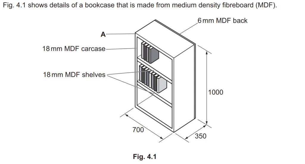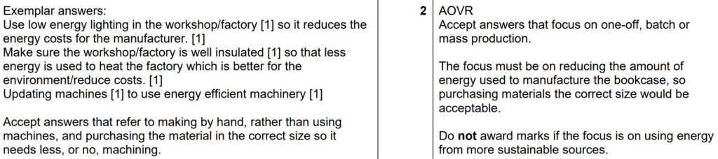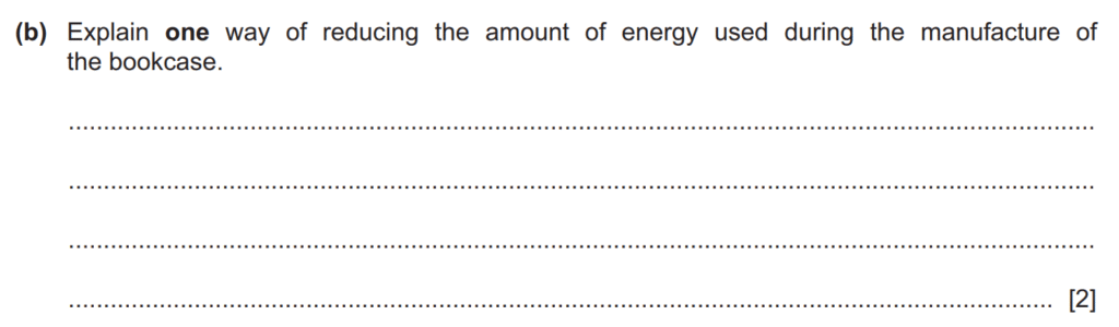 Examiner comment: Most candidates were able to explain one way of reducing the amount of energy used during the manufacture of the bookcase. Some candidates answered this question from the perspective of a one-off production and others from quantity production. Many candidates referred to making the bookcase using hand production techniques rather than machines powered by electricity, purchasing the materials in the correct sizes so that less machining was needed, purchasing materials locally so less energy was used in transportation, the use of low energy lighting or machines in the workshop and making sure the workshop was well insulated so that less energy was used to heat it. A small number of candidates incorrectly referred to using alternative sources of energy, such as solar power, that would not reduce the amount of energy used.