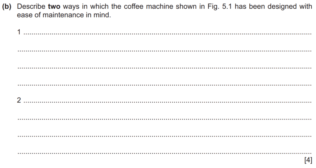 Examiner comment: Candidates were asked to describe two ways in which the coffee machine has been designed with ease of maintenance in mind. Answers included that the parts of the coffee machine are made of materials such as stainless steel and smooth plastic that can easily be wiped clean, that the machine can easily be opened for a mechanic to remove and replace broken parts and that the machine uses standardised components, such as the digital display that are readily available and can be quickly replaced if faulty.
