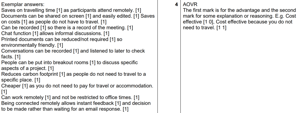 Examiner comment: Many excellent responses were seen to this question. Common advantages for designers using video conferencing to discuss a design proposal included that travelling time and costs are reduced as participants can join remotely from anywhere in the world, that documents can be shared on screen and collectively edited, that discussions can be recorded so that they can be referred to at a later date, that the chat function allows informal discussions and instant feedback and that it is more environmentally friendly as printed documents are not required. Only a very small number of candidates appeared to have little understanding, or experience of using, video conferencing.
