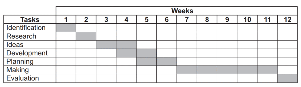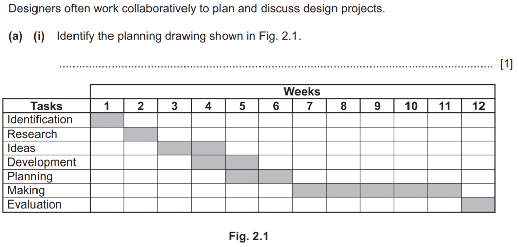 Examiner comment: Most candidates were able identify the given planning drawing as a Gantt chart. Some candidates incorrectly stated that it was a chart or a design process chart.
