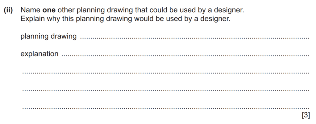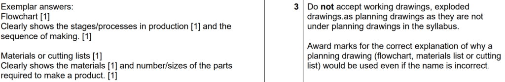 Examiner comment: Common correct answers were a flowchart, cutting list or materials list. The explanation of why a flowchart would be used by a designer often referred to it clearly showing the stages in the manufacture of a product in the correct order. The explanation of why a materials list or cutting list would be used by a designer often referred to these clearly showing the material, size and number of parts required to make a product. Common incorrect answers were often based upon naming and then explaining a type of drawing that was not a planning drawing, for example an orthographic