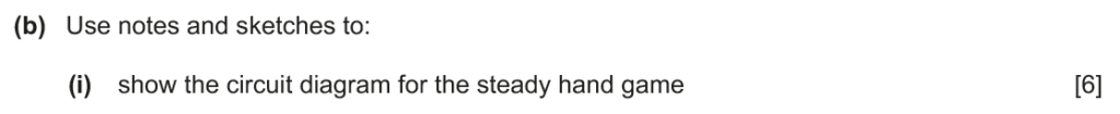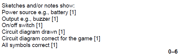 Examiner comment: Most candidates were able to name an electronic input component. Common correct answers included a switch, a battery and a thermistor. For the award of both marks, a clear description was required, for example that a single pole single throw (SPST) switch would turn the lamp on and off by making and breaking the circuit. A small number of candidates incorrectly named an output component, such as a bulb, rather than input component.