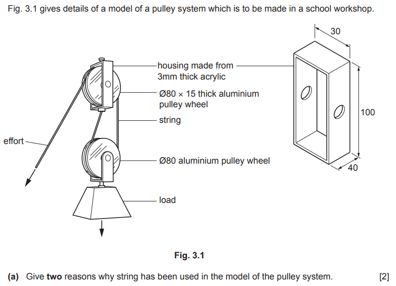 Examiner comment: Most candidates could give at least one reason for using string in the model of the pulley system.