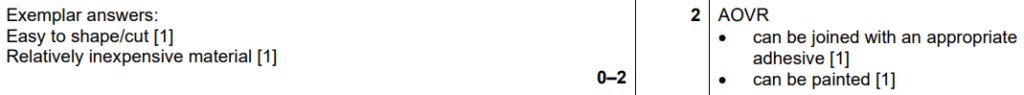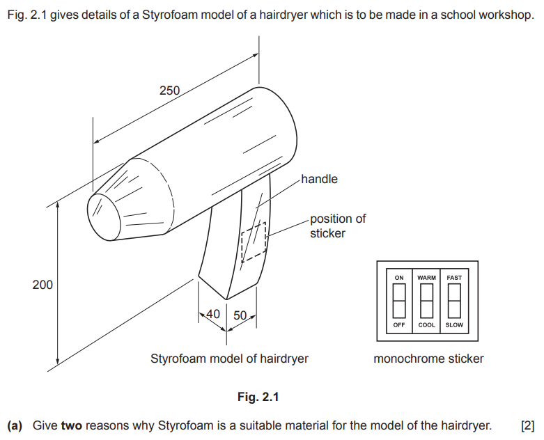 Examiner comment: Most candidates were able to correctly explain at least one reason why Styrofoam is a suitable material for the model of the hairdryer. Styrofoam being easily cut and shaped and having the ability to be painted were popular answers.