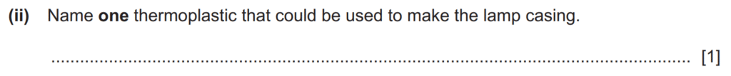Examiner comment: Most candidates were able to name a thermoplastic that could be used to make the lamp casing. Common correct answers included acrylic, polypropylene, polystyrene and acronyms such as HIPS, PVC and ABS. A common incorrect answer was a thermosetting polymer, such as melamine formaldehyde.