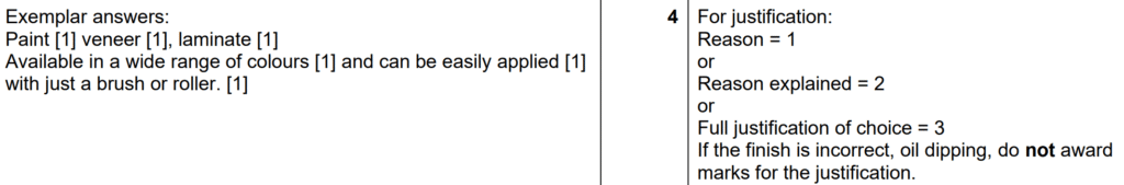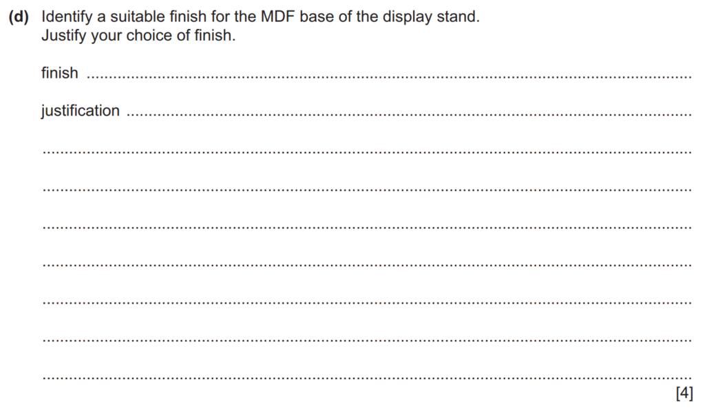 Examiner comment: Many excellent responses were seen to this question. Most candidates were able to identify a suitable finish for the MDF and gave some reasons for their choice. The justifications were usually well reasoned and based upon accurate knowledge of the material and the proposed finish. The most frequently seen finish was paint, with the justification focusing on its availability in a wide range of colours, being relatively cheap to purchase, easily applied with a brush or roller and able to give an attractive finish that is durable and long lasting. Other finishes that were proposed