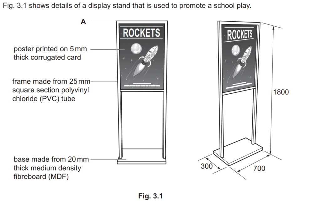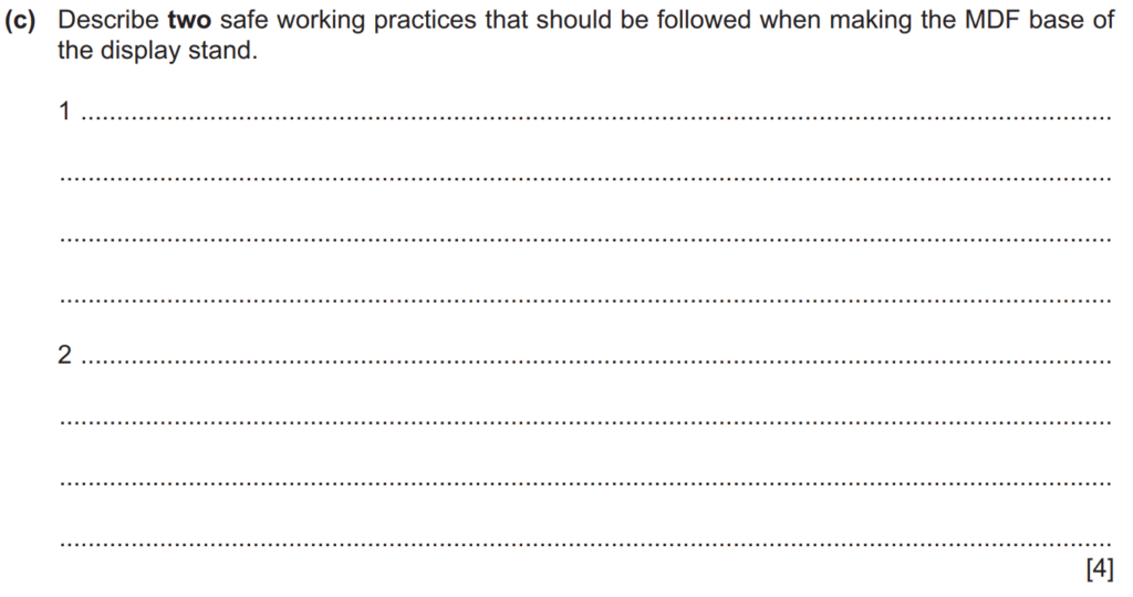Examiner comment: Most candidates were able to describe two safe working practices that should be followed when making the MDF base of the display stand. Common answers included wearing a face mask when cutting the MDF with a power saw to avoid inhaling dust particles or making sure eye protection was worn and all guards were in place when drilling the MDF to prevent dust particles entering the eyes.
