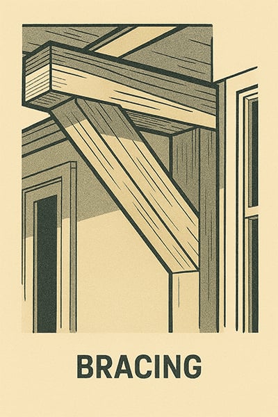 Can be diagonal bracing, shear walls (when a solid wall provides bracing support), or cross bracing (x-pattern)
