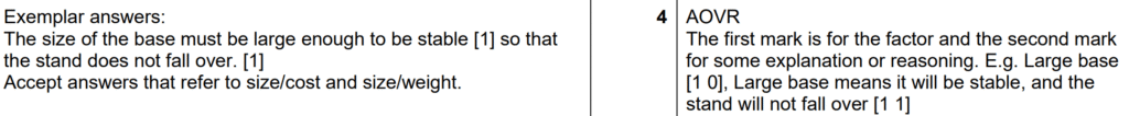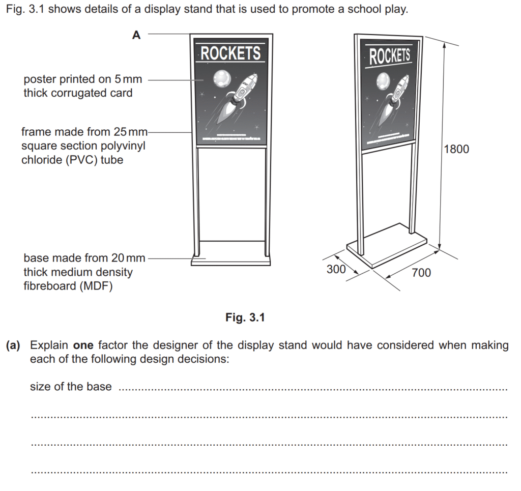 Examiner comment: For the size of the base, most candidates explained that it would need to be large enough to ensure the display stand was stable and would not topple over when in use. Some responses explained that it could not be too large as it would present a trip hazard in a school environment.