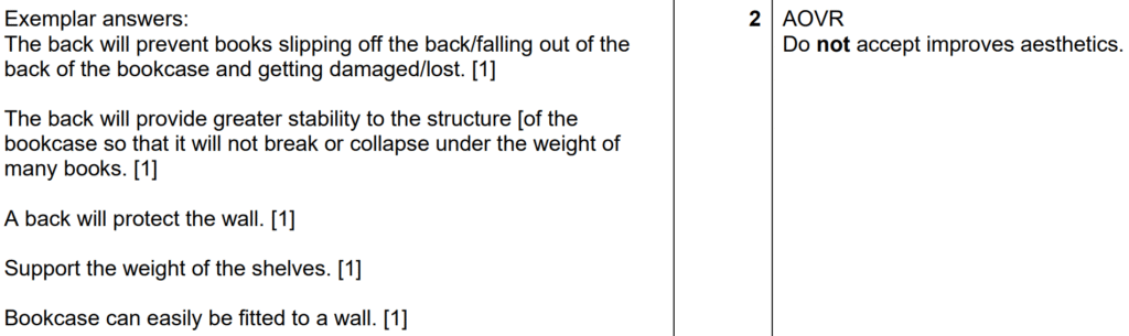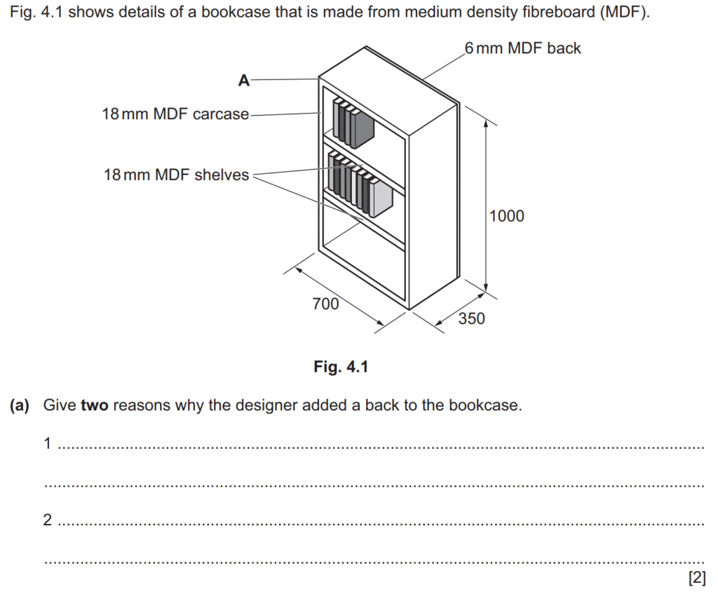 Examiner comment: Almost all candidates stated that one reason for adding a back to the bookcase was to prevent books from sliding off the back. The second reason stated was usually to do with improving the structural stability of the bookcase, giving additional support to the shelves or making the bookcase stronger so that it was able to withstand a force applied to the top corners. A small number of candidates incorrectly stated that that the addition of the back to the bookcase was for aesthetic reasons.