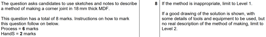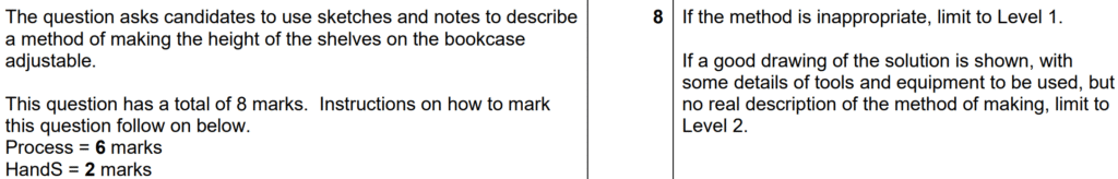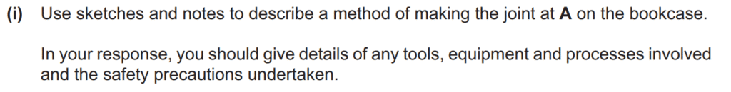Examiner comment: Many excellent responses were seen to this question. Solutions for joining the corner of the bookcase included dowel joints, rebate joints, finger joints, mitre joints, dovetail joints and the use of nails and screws. In weaker responses, the sketches and notes only showed the joint, and not the method of making the joint. Where the method of making the joint was shown, this was usually through a series of steps that included details of tools, equipment and processes to be used. Some candidates did not include details of safety precautions to be undertaken during the making of the joint or only included superficial details of the Personal Protective Equipment (PPE) that would be