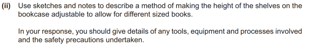 Examiner comment: Many excellent responses were seen to this question. Methods of making the shelf height adjustable were dowels, pegs, slots and a range of brackets. Some candidates focused on making the shelf adjustable to different heights, for example at 150 mm intervals, and others on making the shelf adjustable to any height. In weaker responses, the sketches and notes only showed the adjustment method and not the method of making it. Where the method of making the adjustment method was included, this was usually shown through a series of steps that included details of tools, equipment and processes to be used. Some candidates did not include details of safety precautions to be undertaken during the making of the height adjustment method or only included