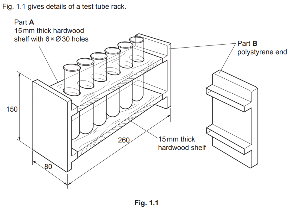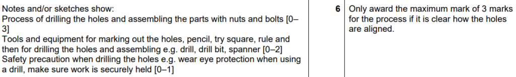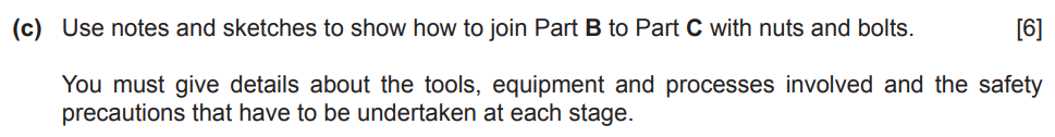 Examiner comment: This was a very well answered question with candidates demonstrating a good knowledge of how to mark out, drill and join Part B to Part C. There were some very good responses that detailed how using a jig or clamping the two parts enabled a more accurate outcome.
