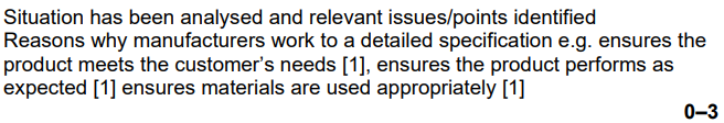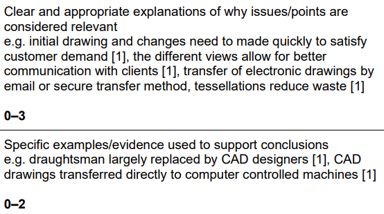 Examiner comment: Candidates gave a broad range of well thought out answers relating to their understanding of why manufacturers of products work to a detailed design specification. Consistent product performance, quality control and the use of materials were regularly clearly detailed. Examples were not always given.