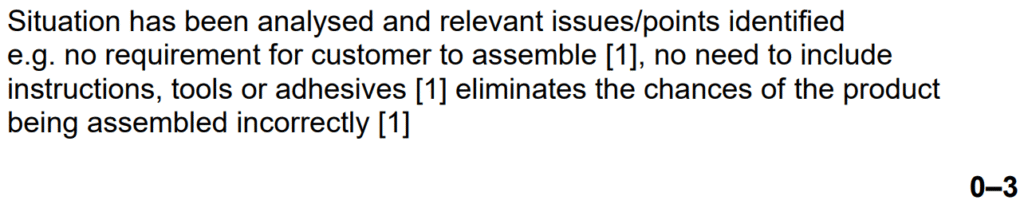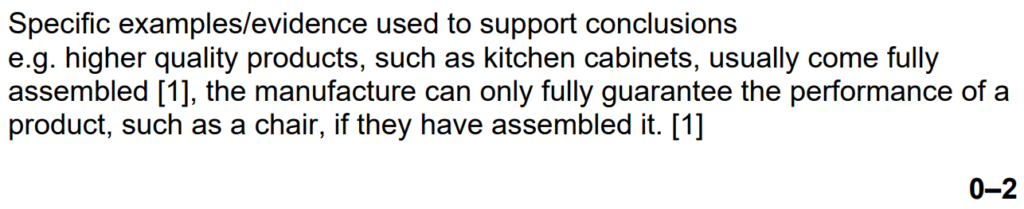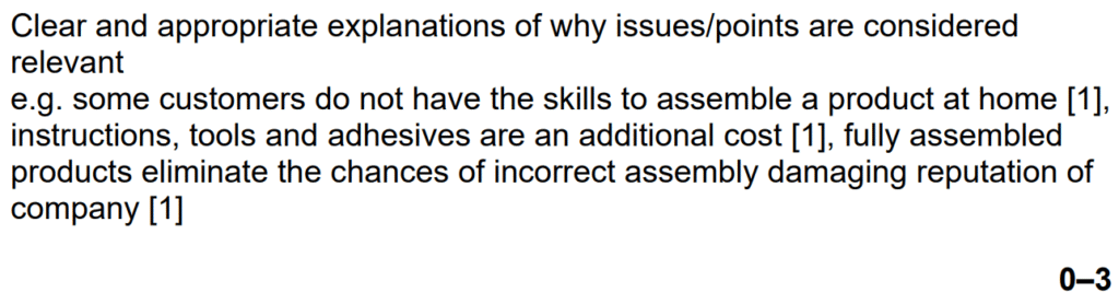 Examiner comment: Candidates gave a broad range of answers relating to their understanding of why many products are designed to be assembled by the customer. Difficulties with transporting large items and saving the manufacturer time and money to assemble products were often communicated well. Thorough