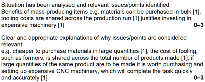 Examiner comment: Candidates gave a broad range of well thought out answers showing their understanding of how manufacturers of mass-produced products can reduce unit costs. Materials being bulk purchased, sharing tooling costs across many products, automation and the reduction in labour costs were often well communicated. Lego was a very well communicated example. Examples were not always given.