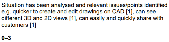 Examiner comment: Most candidates were able to explain why designers use CAD to develop and communicate ideas. Candidates who discussed issues such as how easy it is to share CAD design proposals with customers, the speed of construction on CAD as well as the ease of deleting mistakes or indeed editing a design answered well. Examples were not always given.