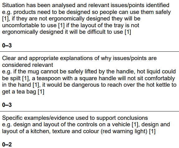 Examiner comment: Candidates often had a good understanding of why designers consider ergonomics during the design process. User comfort, accessibility and safety with hot liquids were often given in responses.